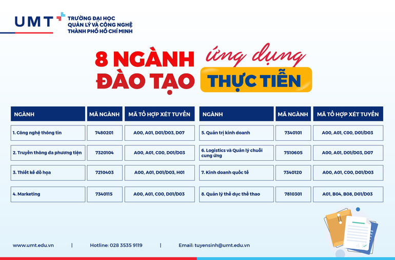 Năm 2024, UMT sẽ tuyển sinh 8 ngành đào tạo theo định hướng ứng dụng, thực tiễn, chương trình đào tạo tham chiếu chuẩn kiểm định nghề nghiệp quốc tế (ACBSP, ASIIN, NASAD), kết hợp tinh thần giáo dục khai phóng, ngoại ngữ... nhằm mang đến môi trường học tập và phát triển toàn diện cho sinh viên. Bao gồm:
